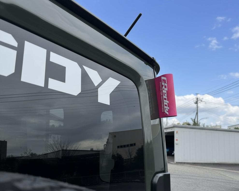 ◆GReddyロゴと三色ストライプを採用。車内のドレスアップに。